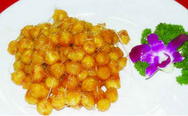 拔丝宣莲,是浙江金华传统的名菜,将莲子倒入糖油锅中,使糖汁包住莲子。然后盛入盘内,再撒上糖桂花,趁热上席。色泽黄亮,外焦脆,内粉糯。